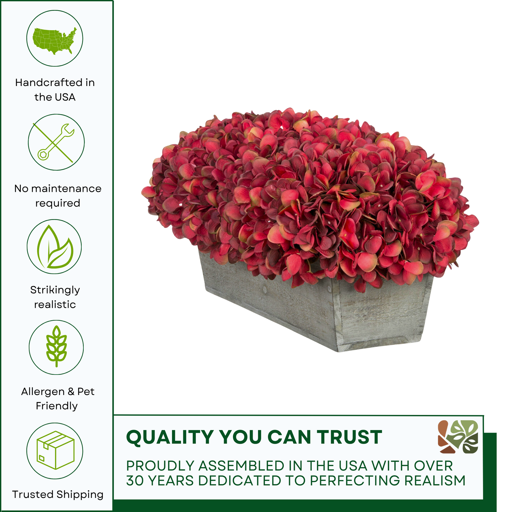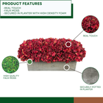 The full, realistic blooms are securely “planted” in a rustic grey-washed wood ledge planter that blends beautifully with both traditional and modern décor styles. Ideal for console tables, windowsills, bookshelves, or office spaces.
